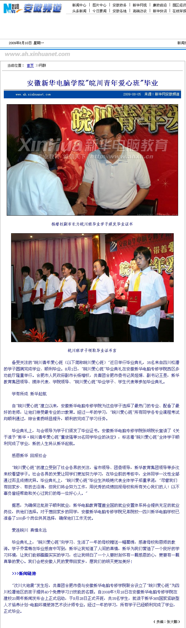 當前位置:首頁 > 新聞中心 > 青春新華 > 新華網特別報道新華皖川愛心班順利畢業(yè)