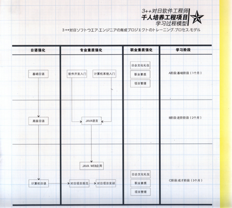 2004年9月在北京召開的第八屆中日信息服務產業懇談會上,眾多的日本企業及我國對日軟件外包企業紛紛闡述對日軟件人才的迫切渴求,一致認為日語軟件人才的稀缺已經成為軟件外包行業的瓶頸。由此,北京市政府推出雙千計劃。即每面培養1000名會說日語的軟件工程師,重點培育出口額在1000萬美元以上的企業。3++對日軟件千人培養工程正是針對我國現狀,響應國家政策、計劃性地向企業輸送對日軟件人才的標準。