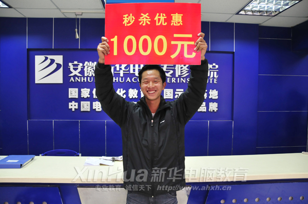 2月13日下午4點(diǎn),在安徽新華電腦專修學(xué)院西區(qū)咨詢中心,一位名叫柳純的學(xué)生前來報名學(xué)習(xí)環(huán)境藝術(shù)設(shè)計(jì)專業(yè)。見到來訪的記者,他興高采烈地介紹,自己參加新華“限時秒殺千元學(xué)費(fèi)”活動,幸運(yùn)地秒殺到了1000元學(xué)費(fèi),接過咨詢老師手中的“1000元秒殺優(yōu)惠”獎牌后,他興奮地高高舉起。
