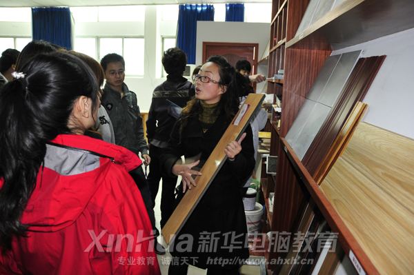 環(huán)境藝術(shù)設(shè)計(jì)師專業(yè)導(dǎo)師蔡老師正在向?qū)W生們介紹關(guān)于木地板材質(zhì)的知識