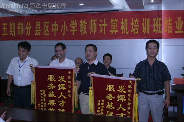 結(jié)業(yè)儀式上,省政協(xié)領(lǐng)導(dǎo)與新華的領(lǐng)導(dǎo)們共同為接受培訓(xùn)的120名教師辦法結(jié)業(yè)證書,學(xué)員代表向安徽新華電腦專修學(xué)院、新華學(xué)院贈送錦旗,上面寫著“服務(wù)基層教育、發(fā)揮人才優(yōu)勢”的字樣,以表達(dá)對新華免費承辦計算機培訓(xùn)、以教育方式回報社會的公益之心。