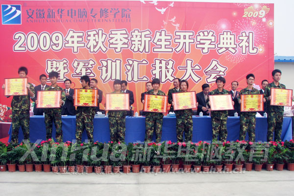 會上,教師代表董洪燕、新生代表魏午分別做了發言。安徽新華電腦專修學院副院長束開俊宣讀了獲得此次獲獎集體和個人名單。最后,在激昂的進行曲中,院領導為在軍訓中表現優異的學子和集體頒發獎狀并合影留念。