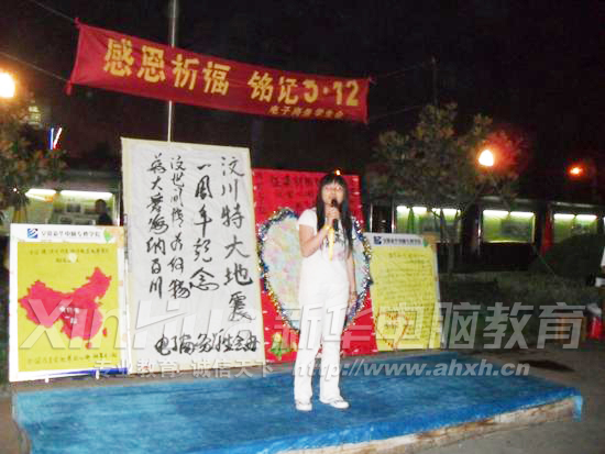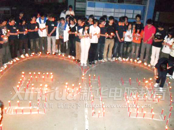 為悼念在5·12大地震中罹難的同胞們,5月12日,安徽新華電腦專修學院電子商務學生會在西區舉辦了汶川大地震悼念活動。此次悼念活動內容有兩項:5月11號至5月12號通過擺展臺和班級宣傳,向全體新華師生征集他們對汶川的祝福;5月12號晚上8:00點燃心形蠟燭為汶川祈福,并通過感人的節目表達我們為汶川加油。參加活動的有365西校區的各兄弟社團、阿里巴巴定向培訓班和若干班級,活動得到了校領導的大力支持。