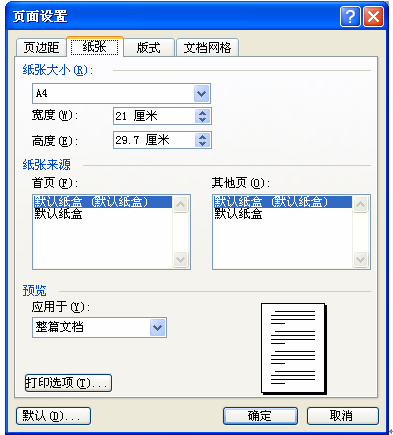 由于各人使用的顯示器尺寸不同及畫幅調整的習慣不同,因此在此無法給出一個固定的數據。請先將顯示器的畫幅調整妥當,以能夠最大限度地顯示出完整的全屏幕窗口為準。找一張A4紙,用尺子量下紙張的寬度,要求精確到毫米,因為標稱為某種開本的紙張,其實際大小并不一定與標稱值相同。然后,新建一個空白文檔,單擊“視圖”菜單,選擇“頁面”,再單擊“文件”菜單,選擇“頁面設置”,在“頁面設置”對話框中將打印設置中的“紙型”設置為與準備的紙張相同的紙型,如在此為A4,再將“紙型”選項卡中的紙張寬度設置為與剛才量好的值完全一致,如圖1-1,確定后返回編輯界面。
