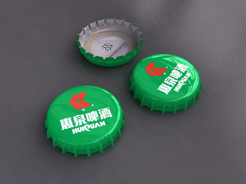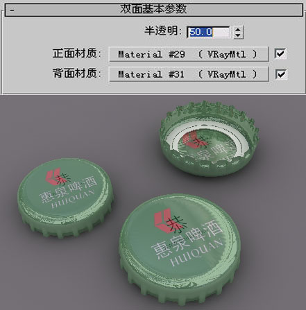 分析這個渲染結果,我們發(fā)現(xiàn)兩個正面瓶蓋的結果是正確的,但是反面瓶蓋的結果不正確,它仍然顯示正面效果。此時我們將總材質(zhì)級別中的“半透明”選項設為50,再進行一次渲染,效果如圖9-9所示。