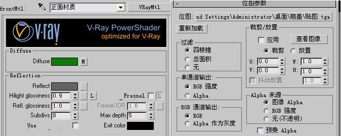 (2) 單擊進入“正面材質(zhì)”,按照剛才我們的分析,我們將正面材質(zhì)類型改為VRayMtl基礎材質(zhì),設置漫反射為綠色,并且在其通道中貼入正面貼圖,注意啟用tga 貼圖的alpha通道以使文字產(chǎn)生漏空,參數(shù)設置如圖9-6所示。