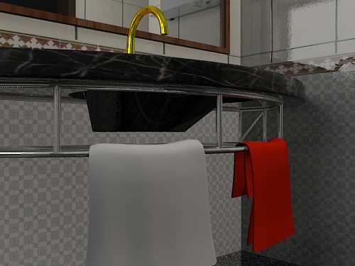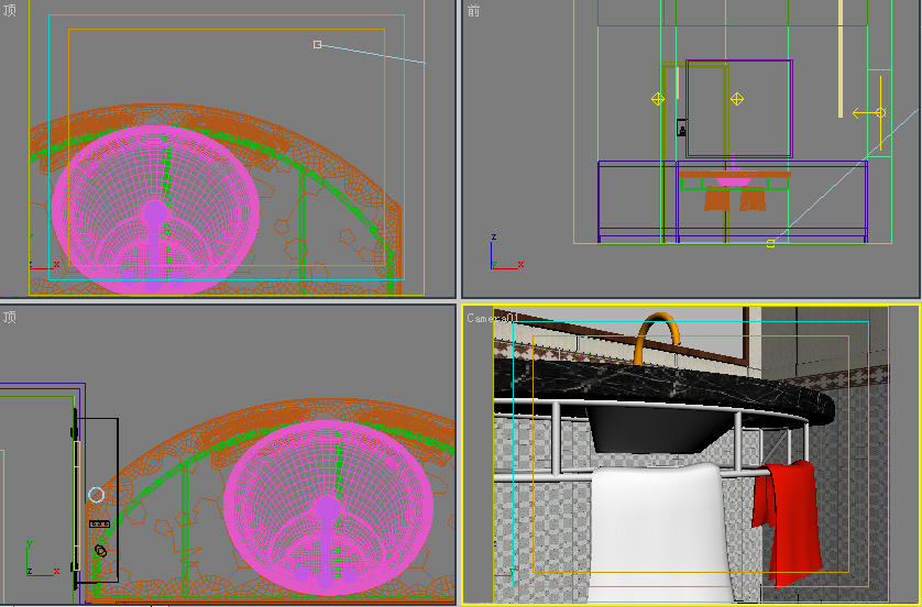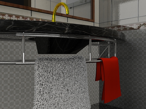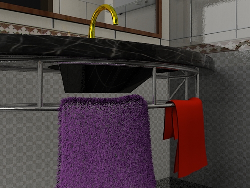 打開我提供的一個默認場景,如圖7-1所示。這是一個衛生間的一角,在洗手池的下方鐵架上搭著兩條做好的毛巾,這就是我們要表現的重點,我們將要用毛發系統為這些毛巾表達出毛茸茸的質感效果。