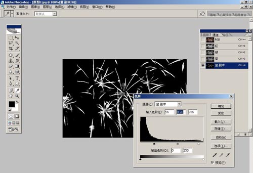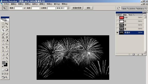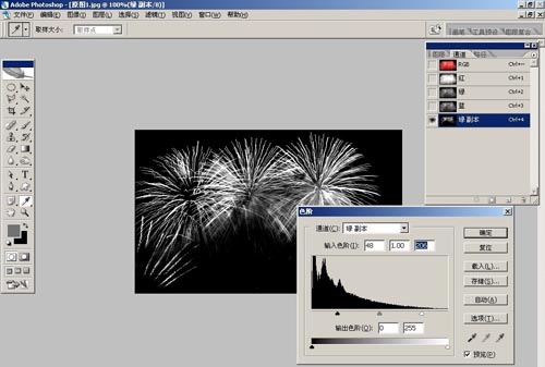 2、打開原圖素材圖1、選擇通道面板,因為在播放煙花動畫時不希望有那么多的煙霧,所以所擇一個對比強,背景干凈的綠色通道,將綠色通道復(fù)制,Ctrl + L色階調(diào)整。如圖1-2