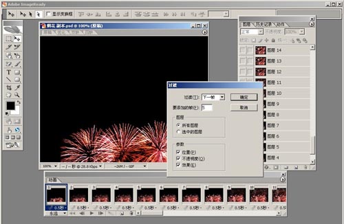 13、在photoshop中將所有圖形效果編輯好,直接鏈接到ImageReady中。打開動畫面板復(fù)制幀。如圖1-13