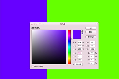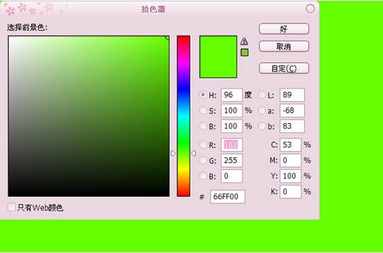 2)設置前景色RGB值為(102、225、0),按下Alt+Delete鍵填充前景色圖層。如圖所示: