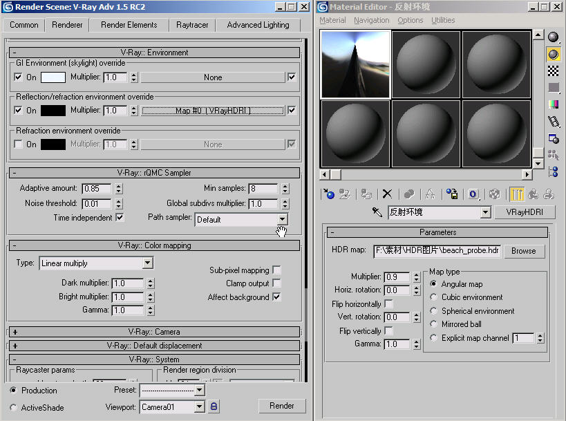 (5)觀察渲染的效果,發(fā)現(xiàn)金屬材質(zhì)一片漆黑。這是什么原因呢?經(jīng)過(guò)分析,原來(lái)是我們沒(méi)有為場(chǎng)景增加相應(yīng)的環(huán)境,因此金屬反射默認(rèn)的環(huán)境色黑色才導(dǎo)致如此結(jié)果。沒(méi)問(wèn)題,找到了原因之后我們來(lái)為場(chǎng)景環(huán)境添加一張VRAY HDRI貼圖作為環(huán)境即可,環(huán)境貼圖用戶可自行設(shè)定,這里我給出參考設(shè)置,如圖1-6所示。