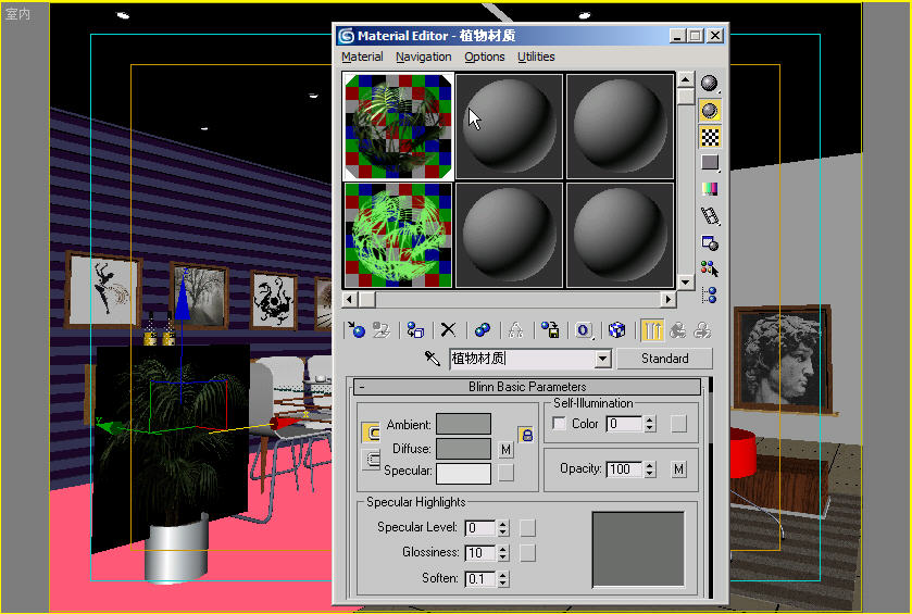 對待這種情況,我們可以只取消植物的表面通道貼圖,而保留它的透明通道貼圖,表面色設(shè)定和自發(fā)光設(shè)置與步驟(6)中完全一樣,通道材質(zhì)球及渲染效果如圖1-6所示。