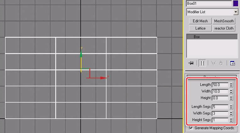 (1) 首先在Create(創(chuàng)建)面板Standard Primitives(標(biāo)準(zhǔn)幾何體)中選擇Box(長(zhǎng)方體)物體,然后在Front(前)視圖建立出Box(長(zhǎng)方體)物體,Box(長(zhǎng)方體)物體的Length(長(zhǎng))為50,Width(寬)為100,Height(高)為0,內(nèi)部Length Segs(長(zhǎng)度段數(shù))為5,Width Segs(寬度段數(shù))為3,Height Segs(高度段數(shù))為1,如圖4-1。