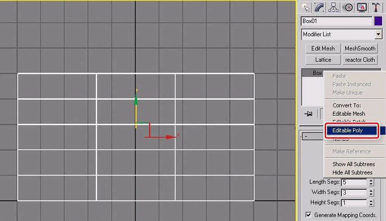 (2) 在Modify(修改)面板Box(長(zhǎng)方體)物體命令上單擊鼠標(biāo)的右鍵,然后在彈出的快捷菜單中選擇Convert to(轉(zhuǎn)換為)>Convert to Editable Poly(轉(zhuǎn)換為編輯多邊形)命令,將長(zhǎng)方體轉(zhuǎn)化成Edit Poly的編輯模式,如圖4-2。