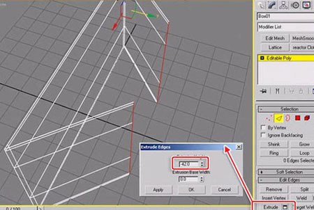 (4) 回到Perspective(透視)圖中,選擇邊緣的兩組線(xiàn),點(diǎn)擊Edit Poly (編輯多邊形)命令中的Extrude(擠壓)命令,得到了兩組新的面。Extrude(擠壓)命令Extrusion Height(擠出高度)的具體數(shù)值是-42,如圖4-4。