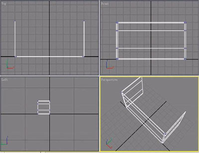 (5) 選擇Edit Poly(編輯多邊形)命令中的Vertex(點(diǎn)),把剛Extrude(擠壓)的兩組新面做位置上的調(diào)整,調(diào)整的和初始創(chuàng)建面成90度角。一個(gè)簡(jiǎn)單的三面墻體就制作出來(lái)了,如圖4-5所示。