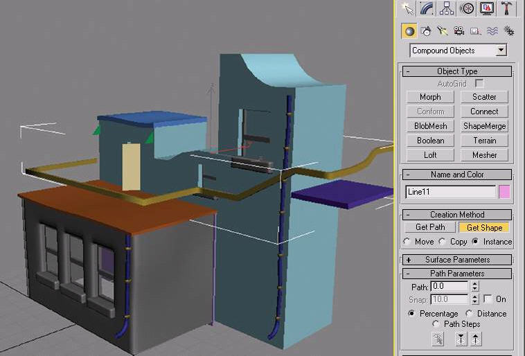(12) 繼續(xù)用Line(線)制作出樓梯底部扶手的截面圖形,然后選擇剛剛建立的路徑Line(線),在Create(創(chuàng)建)面板Geometry(幾何體)Compound Objects(合成物體)中使用Loft(放樣)命令。點擊Get Shape(拾取截面圖形)命令按鈕,選擇截面圖形,制作出樓梯底部扶手,如圖8-3所示。