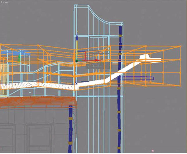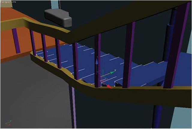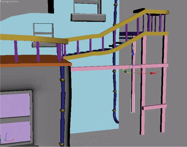 (11) 在Create(創(chuàng)建)面板二維圖形中選擇Line(線),在Top(頂)視圖建立出樓梯的走向,注意轉(zhuǎn)折處的調(diào)節(jié)。建立完成后回到Perspective(透視)圖中,繼續(xù)調(diào)節(jié)樓梯Z軸向的位置,如圖8-2所示。