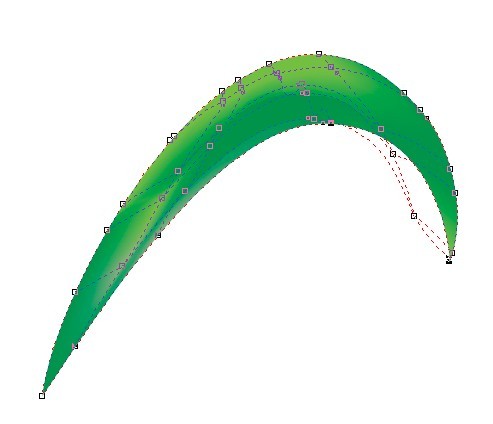 接下來,我們要繪制花徑了,畫條曲線,一條為細線,一條為粗線,顏色為淺綠和深綠。再使用交互式調和工具進行調和,要居中對齊,如圖示: