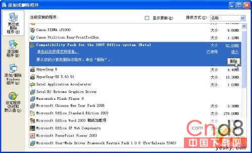 如果有一天你不用這個補丁了,可以打開“控制面板”中的“添加/刪除程序”,找到列表中的“Compatibility Pack for the 2007 Office system (Beta) ,點擊“刪除”按鈕按照提示完成刪除操作(圖3)。